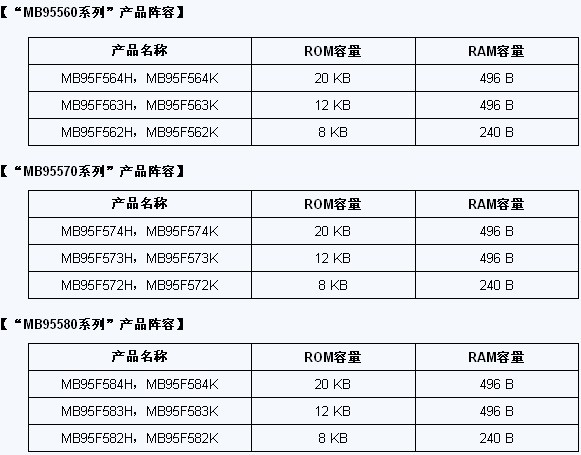 MB95560 series is fully pin-to-pin compatible with MB95260. This series of products are based on "F2MC-New8FX family”, which use a dual-channel FLASH technology allow the program to read and write on another channel FLASH when it operates on FLASH, thus to protect important data required by customers. The family also integrates a multi-channel general-purpose timer with high variety, high-resolution A / D converter, oscillator, low-voltage detection circuit and the LIN-UART circuit, which greatly minimize the parts of customer’s system, thus to lower the cost of the product.