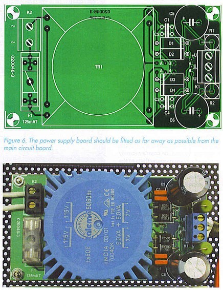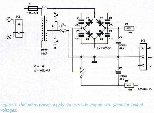 A large part of the stabilisation, decoupling and hum suppression for the supply voltages takes place locally on the main circuit board, for both the digital portion (+5 V) and the analogue portion (5V). The only other thing you need is a sufficiently stable source of symmetrical DC voltages (which shouldn’t be a problem with the low current consumption). This provides an opportunity to use a general-purpose low-power mains power supply (Figure 5).