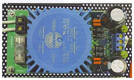 First connect the power supply boards and check the voltages at their outputs. Due to the high open-circuit voltage and the combination of rectification and filtering, the measured voltage will naturally be somewhat higher than the 7 V specified for the transformer.