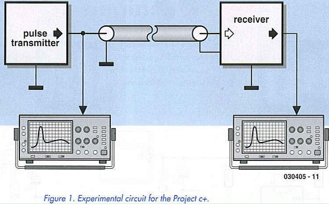 The experimental set-up is shown in Figure 1. The pulse transmitter on the left of the diagram generates a signal pulse that is sent through the medium (either an optic fiber or simple cable) to the receiver circuit on the right hand side of the diagram. Two oscilloscopes are used to display the signal pulse when it is introduced to the medium and recovered by the receiver. The purpose of Project c+ is to demonstrate that by careful matching of the pulse to the fundamental characteristics of the transmission medium it is possible to achieve vastly reduced propagation delays.