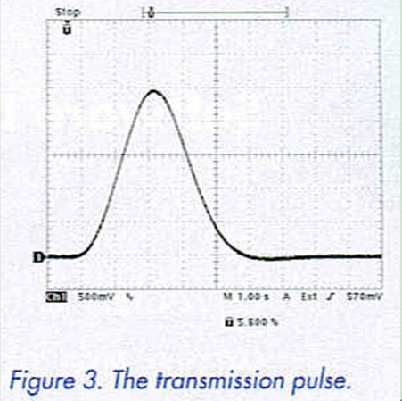 There are two possible power supply configurations for the circuit: either plus and minus 4.8 V consisting of eight NiMH AA type cells (if the TL082 op-amp is used) or a single-ended 4.8 V supply if a precision rail to rail op-amp like the OP290 is used. In this case the negative pole of the supply must be connected to the earth and all minus supply connections in the circuit diagram. To be scientifically rigorous the generator and receiver should be powered from separate power supplies to avoid cross coupling but a common supply will suffice for this experiment. Once the circuit is completed the output waveform of the I-Ging generator can be observed on an oscilloscope. When SI is pressed a transmission pulse similar to that shown in Figure 3 will be generated and sent down the medium. Each square graticule represents 1 second.