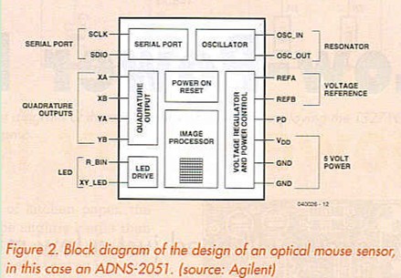 Finally, a quick look at the output signals produced by the mouse sensor. The cheaper sensors are limited to a serial output, which transmits the X- and Y-displacement data to a processor in the mouse for further processing. Larger sensors often have additional quadrature outputs, which provide signals similar to a mechanical mouse. In principle you could use such a sensor to modify an existing mouse yourself...