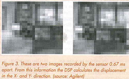 At first glance, it would seem easy to detect the movement of the mouse using an optical system. But behind this simple idea hides some complex electronics that’s comparable to a simple video camera combined with an intelligent digital movement detector. Figure 1 shows a cross-section of the mouse near the optical sensor. All the electronics, including the ’camera’ part and the lens, are contained in a single IC labeled sensor in the diagram (Figure 2 shows a block diagram of the IC). An LED next to the IC provides for sufficient illumination of the surface over which the mouse is moved. The sensor catches some of this reflected light and translates it into an image. The camera section is relatively small, usually only 2020 or 30_30 pixels. These generate a black-and-white image for the image-processor (a DSP), which repeatedly performs a pattern analysis and compares this with the previous pattern. Using patented technology, the DSP can deduce in an instant in which direction the pattern is moving and at which speed. Figure 3 shows two images separated in time by about 0.7 ms. The processor recognizes similar patterns in each of these images and uses these to calculate the displacement in the X- and Y-direction.
