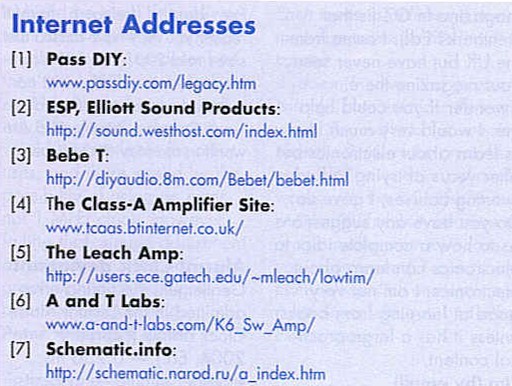 A well elaborated design for an amplifier with relatively high output power (2 x 350 W into 8 Q) may be found at a website called A and T Labs [6]. The power output section is built around complementary power MOSFETs. Another peculiarity of the design is the application of a switch-mode power supply unit (SMPSU) with a whopping output of 1 kW, allowing the entire assembly to be housed in a relatively low 19-inch rack. To close off this article we’d like to draw your attention to Schematic.info [7], a website packed with circuit diagrams of twentieth-century audio classics like Dynaco, SAE. Quad, NAD and Crown. Take your pick!