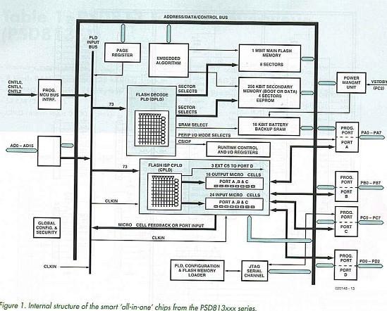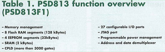 Okay, if all these microcontroller circuits are so similar, why not design a single integrated circuit that contains all functionality? That way, circuits can become much smaller and the designer could concentrate on those points that are unique to the circuit. This, we figure, must have gone through the heads of several designers at STMicroelectronics (formerly SGS Thomson), the general idea having culminated in a series of ICs called ’PSD813xxx’. The individual components inside the chip are found back in Table 1. Obviously, this IC offers far more possibilities for a wide variety of microcontroller circuits.