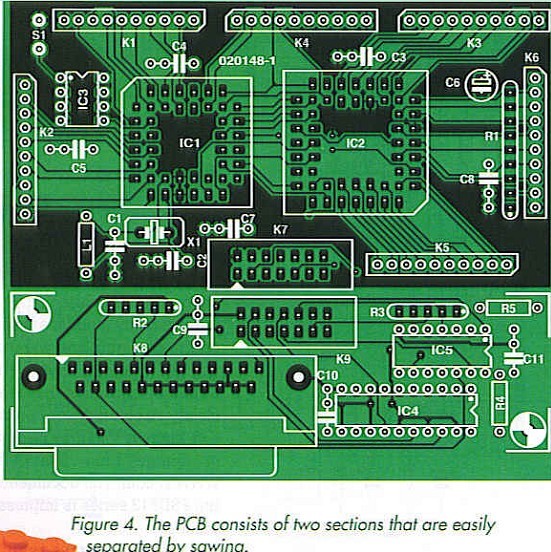 Having purchased the printed circuit board and all components you are ready to start building the circuit. As shown in Figure 4, the PCB consists of two sections that are easily separated using a hacksaw. One section is for the interface with the PC, the other, for the drop-in module proper.