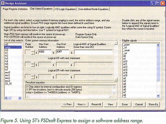Having launched PSDSoft Express you are ready to create a new project. Programming the PSD chip could not be easier using the wizard. The individual pins of the PSD chip connected to the JTAG interface and the controller are immediately assigned names by the wizard. Figure 6 illustrates the ease of defining an extra CS signal. Once all steps have been completed, the PSD chip is ready for programming through the JTAG interface.