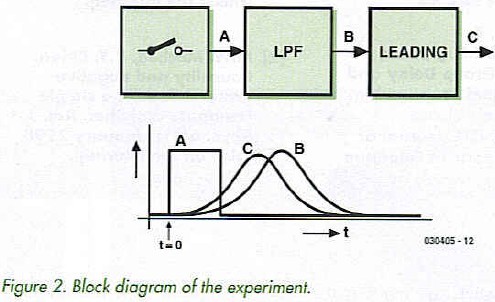 Causality states that in our physical world the flow of events is always the same: first, cause, then effect. You are aware of pain in your thumb after you hit it with a hammer and not before the unfortunate accident. If this principle is universal, is it possible in our simple circuit that a signal arrives at the output of a filter before it was applied to the input? Clearly not. To understand what really is going on in the circuit we need to take a closer look. Figure 2 shows a block diagram representing the main parts of the circuit. A rectangular pulse is generated when the switch is momentarily closed at t = 0. A low-pass Filter (LPF) is used next to filter out the high frequency components and produce a smoothed Gaussian impulse at B. The pulse is now introduced to the medium and recovered by the lead filter to produce the output pulse C. The recovered pulse is amplified to produce the output pulse C so that its shape is similar to the input pulse.