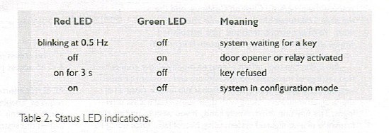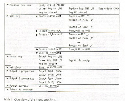 The menu structure is quite simple and intuitive. If you use Table 1 as a reference, you should not have any significant problems. Nevertheless, a few remarks are in order with regard to keys and access privileges (which are called ’access rights’ in the menus). A particular iButton can only be stored once in the memory. If you try to program the same iButton into the system more than once, an error message will appear.