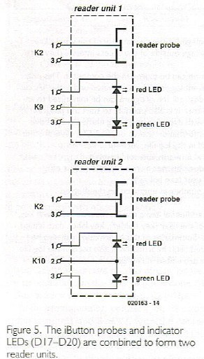 For the prototype, cast aluminium boxes were used for this purpose. Besides an iButton probe, each box was fitted with red and green status LEDs. The necessary connections are shown in Figure 5.