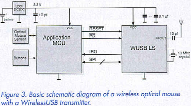 Cypress offers a variety of ICs and development kits for users of the WirelessUSB family. At least two units communicating wirelessly with each other are always required for product development. The basic architecture of the IC is shown in Figure 2, using the CYWUSB6934 as an example. A developer’s kit is available for this type and several other types. Strictly speaking, each of the ICs in the CYWUSB69xx family is just an integrated RF data transmitter or transmitter/receiver (transceiver) with an SPI interface, which makes it a sort of SPI/RF interface (SP1-RF bridge). The CYWUSB6934 is a transceiver of this sort with an SPI interface. The only difference between the CYWUSB6932 transmitter IC and the CYWUSB6934 transceiver IC is that the receiver portion with the RF input (RFIN), shown outlined in Figure 2, is omitted in the transmitter IC. The CYWUSB6932 is thus suitable for applications such as a wireless mouse (Figure 3), where it is only necessary to transmit data and the receiver channel is unnecessary. Figure 4 shows a typical block diagram of the circuit at the USB host end (PC end). In this case it is naturally necessary to have a receiver channel, which is provided here by the CYWUSB6934 acting as a WUSB transceiver for bi-directional communication. The second IC in this circuit is a Cypress enCoRe USB controller, which provides the USB link to the PC. This combination works without any special driver and utilises the Microsoft USB HID class. It supports up to six peripheral devices and offers several different error correction methods (FEC, CRC and ARQ), as well as 128-bit encryption. The circuit does not require any external chokes, and the antenna is implemented in the transceiver IC. The ICs comply with the USB power saving standards, and all ICs in the Cypress WirelessUSB family are optimised for operation using disposable or rechargeable batteries (2.4-3.6 V).