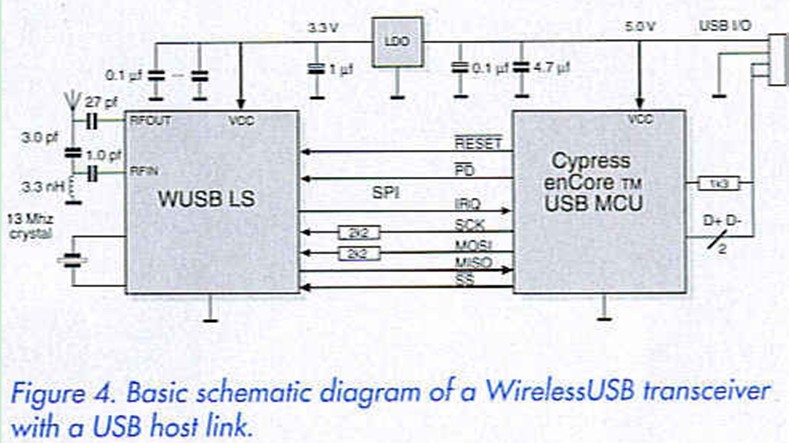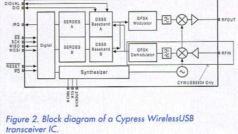 The Cypress wireless USB family is already in production (since 2003). It uses the 2.4-GHz band, which is available for use without licensing in most countries, while the frequency range preferred by Intel and the MBOA (3.1-10.6 GHz) can be expected to encounter problems with licensing, as it is often used for military purposes in Europe.