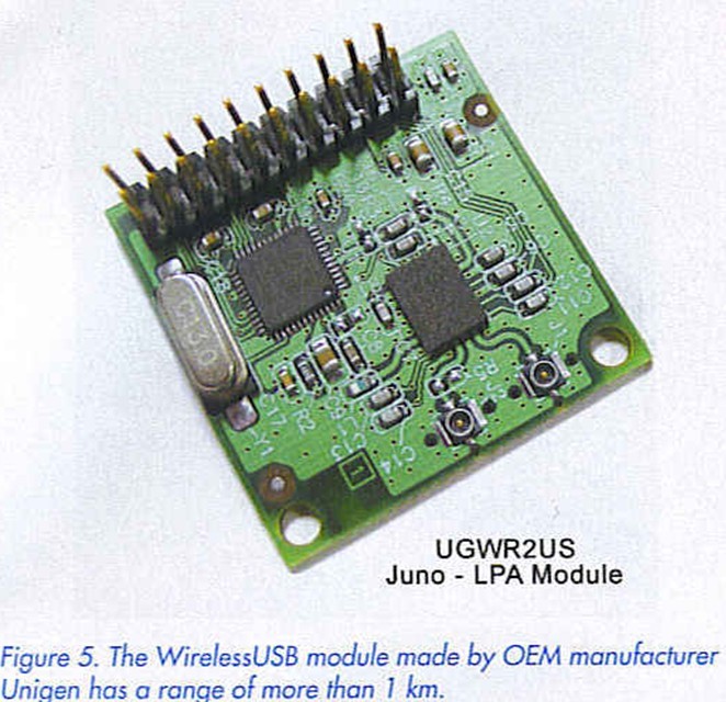 During this year, Atmel will become the second IC manufacturer to produce and supply WirelessUSB™ ICs. A corresponding licensing agreement with Cypress was announced in late June. WirelessUSB is also being supported by OEM manufacturer Unigen, which started producing low-cost modules using Cypress WirelessUSB components in June. The first deliverable product is a transceiver module called ’Juno LPA’ (Figure 5). The Juno LPA module supports separate transmit and receive antennas and has a supplementary RF output stage for an increased range of more than 1000 m.