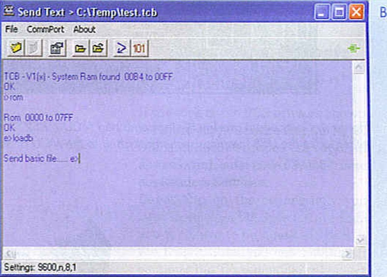 Built into TCB is the ’LOADB’ command that has a very simple protocol and it works like this. After issuing the command TCB waits for a line of BASIC to be sent, when the line is received it is processed and an ASCII code 6 (ACK) is sent back to the terminal to indicate it is ready for the next line. This simple protocol works exceptionally well and the ByVac terminal has this protocol built in.