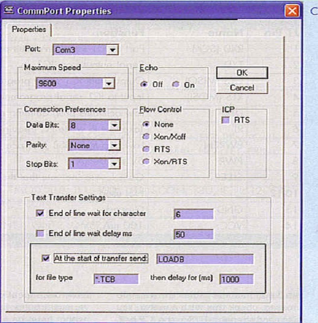 The program will load, type RUN to see the fruits of your efforts. To speed things up if you alter the text transfer settings to that of Figure C. The terminal will now type in LOADB for you if you select a file with an extension "tcb". Changes to the RS232 settings require the connection between the PC and the Swiss Army Knife to be broken and then restored again.