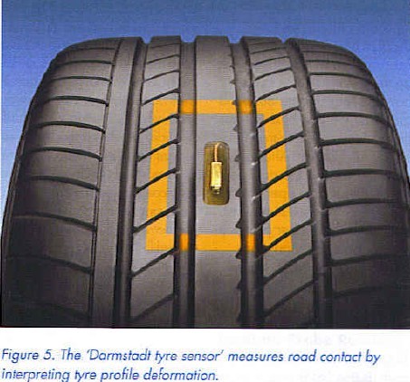 Still more security is afforded by an additional tyre parame¬ter which is actually the most important: road contact. Using this real-time information, anti¬blocking and vehicle stabilization systems could be made to work even better. The ’Darm¬stadt tyre sensor’ (Figure 5) is a joint development by Conti¬nental and the University of Darmstadt (Faculty of Vehicle Technology, Prof. Winner). It records deformation of the tyre profile elements when in con¬tact with the supporting sur¬face. The current version employs a surface-wave sen¬sor in the tyre profile and has not yet left the test bench. The adaptation to ’real life’ on the road is problematic because the sensor is expected to measure as well as transmit when it is in contact with the road. At that instant, the RF contact is hindered by the wheel rim. There remains a lot to explore and research. If, however, researchers are suc¬cessful, they can pride them¬selves in having reduced the number of road accidents even further.