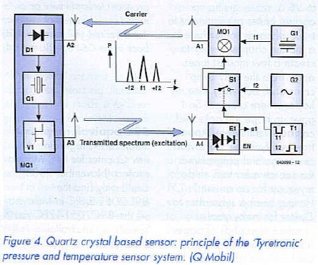 Still another principle has been adopted by IQ Mobil (Munich, Germany) for their tyre pressure monitoring systems. The central part is a quartz volume oscillator producing a controlled amount of ’ringing’. The interrogator module emits a microwave signal (at 2.45 GHz) which is amplitude-modulated with a frequency between 6 MHz and 10 MHz. Inside the responder, the RF burst is rectified and the resulting voltage used to excite the quartz crystal (within approx. 1 ms), Next, the AM modulation is removed from the carrier. The quartz crystal will continue to oscillate at its own frequency, but subject to the capacitance presented by the pressure sensor. The result is crystal ’pulling’ to a frequency removed from the excitation frequency. The resultant ringing (oscillation decay, lasting about 2 ms) is mixed with the carrier frequency, hence modulated by it and returned as an RF signal. The control module measures the modulation frequency of the responder signal and employs the deviation from the excitation frequency to calculate the pressure value. (Figure 4). The entyre interrogate-and-respond sequence is completed within 6 ms. The (small) temperature coefficient of the quartz element responsible for the pressure measurement is compensated. In this way, pressure measurements can be performed at an accuracy of ±0.1 bar (1.45 psi).