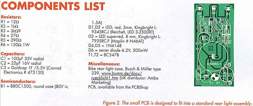 The two documents concerning cycle lighting are the 1989 Road Vehicle Lighting Regulations and British Standard 6102 part 3. Any form of home-made lighting will not have BS approval. The Bike Tail Light described in this article should only be used as a secondary means of lighting which is fitted together with a BS approved system.