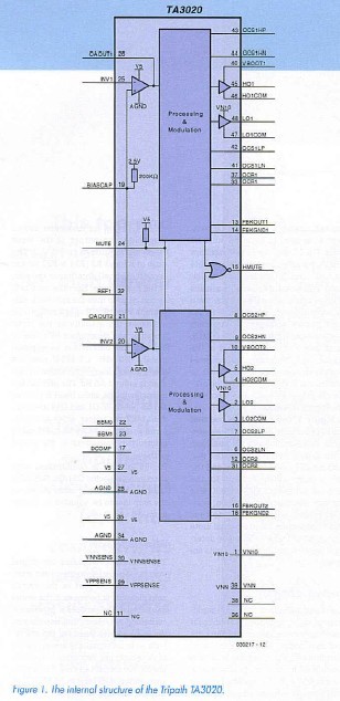 In Figure 1, you can clearly see that the IC essentially consists of three sections for each channel: an analogue input stage (inverting amplifier), a processing and modulation unit, and the driver stages (level shifters) for the external power MOSFETs. The IC also provides overcurrent protection, over-voltage and undervoltage protection, and a connection for an external mute signal. All of these collectively determine whether the amplifier outputs are active.