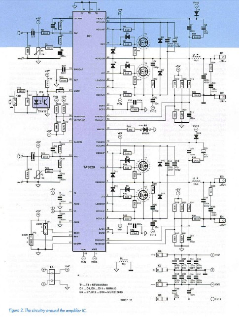 If we’ve given you the idea that the fully assembled amplifier is as light as a feather, perhaps we should qualify our statement somewhat. After all, 2 x 300 watts of true power naturally requires a rather substantial power supply. But that’s the only aspect of this amplifier that is comparable to other types of amplifiers. Thanks to clever use of pulse-width modulation, this amplifier is so efficient that a heat sink with quite modest dimensions can be used, which means that the enclosure can also be kept relatively small. What’s more, this amplifier is not an ordinary pulse-width amplifier. This design, which is based on the Tripath TA3020 Class-T digital audio driver, has excellent specifications and can easily hold its own against other top-end amplifiers. For more information about pulse-width modulation in audio final amplifiers, please see the article ’That’s class...’ elsewhere in this issue. The design is largely based on the standard application example and the manufacturer’s reference PCB layout. This is because the board layout largely determines the quality of the overall amplifier. Besides this, the nature of this design (with high switching frequencies and large currents) imposes severe requirements on various components. That means that special types of electrolytic capacitors and decoupling capacitors are used in most locations. Even for the thermal coupling between the output transistors and the heat sink, ordinary mica or Kapton washers are not satisfactory.