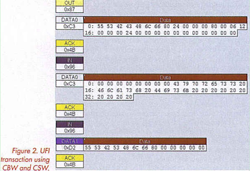 Removable media mass storage devices containing a USB interface use a common interface known as the UFI interface. The SCSI commands are embedded in the UFI packets. A UFI transfer is carried out in three phases: command, data and status. The command phase employs the Command Block Wrapper (CBW) and the status phase, a Command Status Wrapper (CSW).