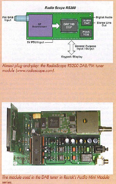 If you look for components for DAB receivers, you will quickly find two British manufacturers: FrontierSilicon and RadioScape. FrontierSilicon’s product line is based on the Chorus FS1010. This IC is a highly integrated multimedia processor with ADC input, a DSP processor core, DAB coprocessors, on-chip RAM and cache memory, and a wealth of on-board peripheral. The DAC is not integrated, so users are free to spend as much as they wish on this component (or as little as they wish, if cost is an objective). For equipment manufacturers, FrontierSilicon also provides convenience products in the form of complete modules that include the RF front end (tuner) and several peripheral components. To produce a complete receiver, the manufacturer only has to add his own user interface (control processor, display and burtons), audio portion (DAC, buffer, sockets or Toslink, etc.), and an enclosure.
