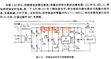As shown in Figure 4-22, the controller includes the buck rectifier, monostable AC solid relay. And 555 and R1, RP1, C4, etc. form a monostable circuit, clicking the AN, the pin 3 of 555 is in high level, the AC output of AC solid relay turns on, load is connected, timing begins. Regular time is the monostable transient stability time td = 1.1RP1C4, the longest time of icon argument is about 30 minutes, it can be adjusted by RP1.