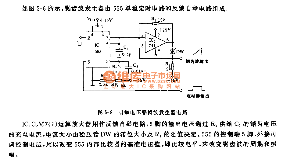 As shown in the figure 5-6, the sawtooth wave generator consists of a 555 single stable circuit and a feedback bootstrap circuit. The IC2 (LM741) operational Amplifier is used as a feedback bootstrap circuit , and the charge current of sawtooth voltage is provided by the output voltage of Pin 6 to C1 through R1, and the current size is determined by the size of the clamp of the voltage regulator tube. The control side of 555 is pin 5, which can adjust and control voltage when attached outside to change the preference voltage of comparator or the comparison level in 555, so that the cycle and amplitude of the sawtooth wave can be changed.