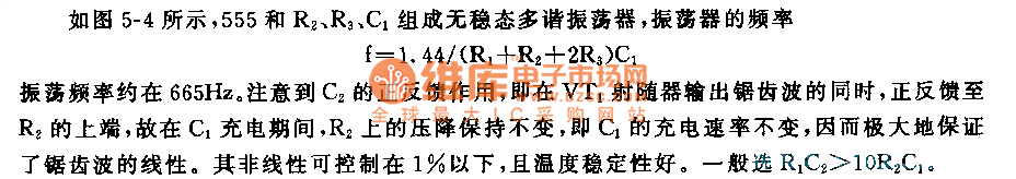 As shown in the figure 5-4, the 555, R2, R3 and C1 constitute a Bi-stable multi-vibrator,the frequency of the Bi-stable multi-vibrator f=1.44/ (R1+R2+2R3)C1 and the oscillation frequency is about 665Hz. Much attention should paid on the positive feedback effect of C2, that is, at the same time that emitter follower VT1 outputs sawtooth wave, the positive feedback goes to the upside of R2.Therefore, the pressure drop on R2 remains unchanged, that means the charge rate of C1 remains unchanged, too. Thus, the linearity of the sawtooth wave is greatly guaranteed. Nonlinearity can be limited to below 1% with excellent temperature stability, generally, it is chose under the condition R1C2>10R2C1.