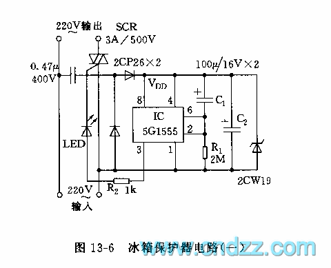 The circuit is shown in Figure 13-6, the circuit is based on 555 circuit to form power delay protection circuit. The connection of C1 makes pin 6 be in high level, and pin 3 be in low level, when the supply is turned again after failure, SCR is cut off. C1 charges, so the pin 2 is lower than the trigger time of 1/3 vdd, that is the delay time td. Icon corresponding td parameter is about 6 minutes. Setting to 555, pin 3 outputs high level. SCR turns on, the refrigerator gets power and the working indicator LED is lit.