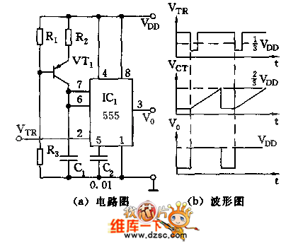 As shown, 555 and R2, C1, VT1 etc. make up a monostable trigger circuit, the difference from the general trigger is thatVT1,R1,R2,R3 make up a constant current source, to charge to C1 with constant current, whichmakes C1's charging voltage linearity good and has precise delay. The delay time td≈1.1R2C1. It is required the trigger pulse cycle time T>td. The output wave is shown as picture below. (a) is circuit. (b) is wave.