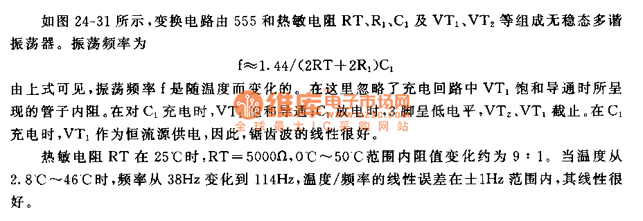 As shown in the picture 24-31, this conversion circuit consists of a 555, and thermosensitive resistances RT, R1, C1, VT1 and VT2, constituting an astable multi-vibrator. The oscillation frequency can be calculated as following formula: