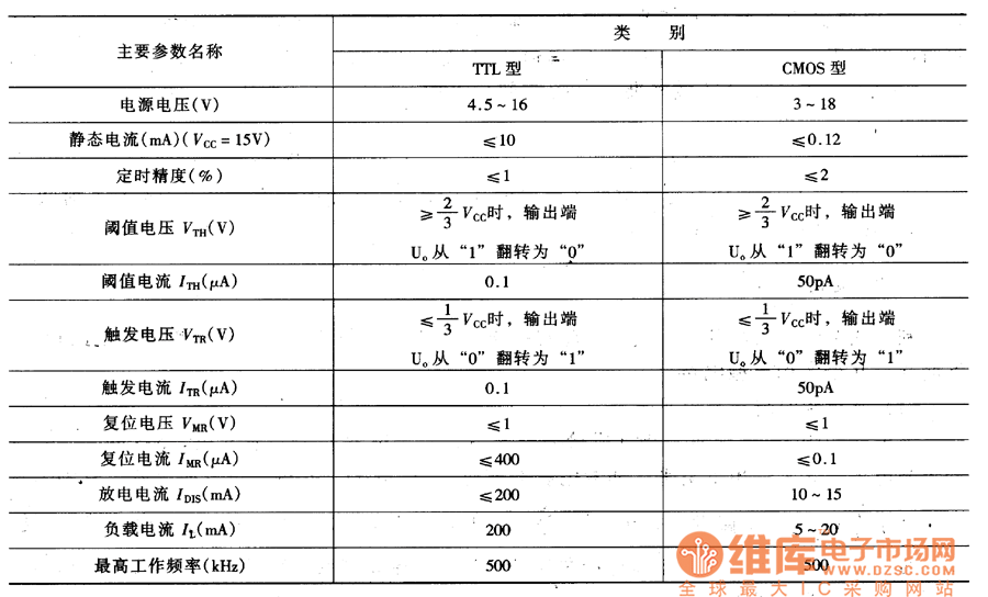 For correctly using the 555 time-base circuit, we should know about its main parameters. The TTL type and CMOS type 555 time-base circuits have difference in their features and parameters. So this table listed their main parameters separately to be used for reference. For dual time-base circuit, the parameters are all the same with the single time-base circuit's except for the its doubling quiescent current. So it can be used by taking the single time-base circuit's main parameters as the reference.