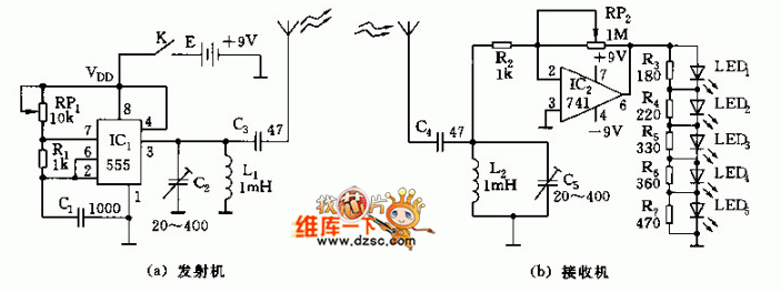 As shown, the car recording device includes the transmitter and receiver. Transmitter constitute oscillator of midband frequency with the core 555, oscillator frequency should be slightly lower than carrier frequency 535KHZ of the AM broadcast, the frequency value depends on R1, RP1, C1, namely f = 1.44 / (RP1 +2 R1). C1, L1, C2 constitute the output resonant circuit, which selects frequency, and then transmit through the C3 by the antenna. Receiving circuit is composed of the input frequency-selective network and 741 op amp. Amplification factor of amplifier depends on RP2/R2. LED1 ~ LED5 is used to indicate received signal strength. Along with the strengthening of the signal, luminotron will be lighted up by the order! !