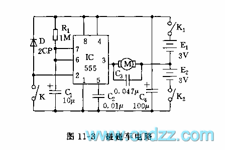 IC adopts ambipolar time base circuit 555, its load current can reach 200mA, it can drive toy motor directly. K1, K2 are toggle switch, when the car moves, K1, K2 are closed, due to 2 foot is high level, 3 foot is low level, the motor terminal's voltage is about 3V(the left is negative, the right is positive), the motor is positive turning, the car moves forward; when the car meets the object, the humper K is butted, 2 foot is connected to ground, the circuit is set, the output turns to high level(about 6V), the motor terminal's voltage is still 3V, but the motor is negative turning, the car gets back. Due to the action of car's reverse wheel, it is moving back and turning. After the circuit is set, C1 is charged by R1, when C1's voltage is charged to more than 6 foot's threshold level 2/3 VDD=2/3(E1+E2)=4V, then the monostable circuit's temporal stability is ended, the car recovers to the former state and moves forward again.