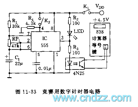 As shown in the figure 11-33, the timing circuit still uses inexpensive 838 calculator as display terminal, it is composed of second clock generator and photocoupler. It can be used in counting second occasions such as sports tournament, intelligence competition, the reading is accurate and visualized, it also has suspensive function.