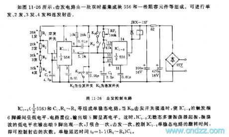 As shown in the figure 11-26, the firing circuit is composed of a double time base integrated block 556 and some resistor capacitor components. It can make single shot, 2 shots, 3 shots, 4 shots and a running fire.