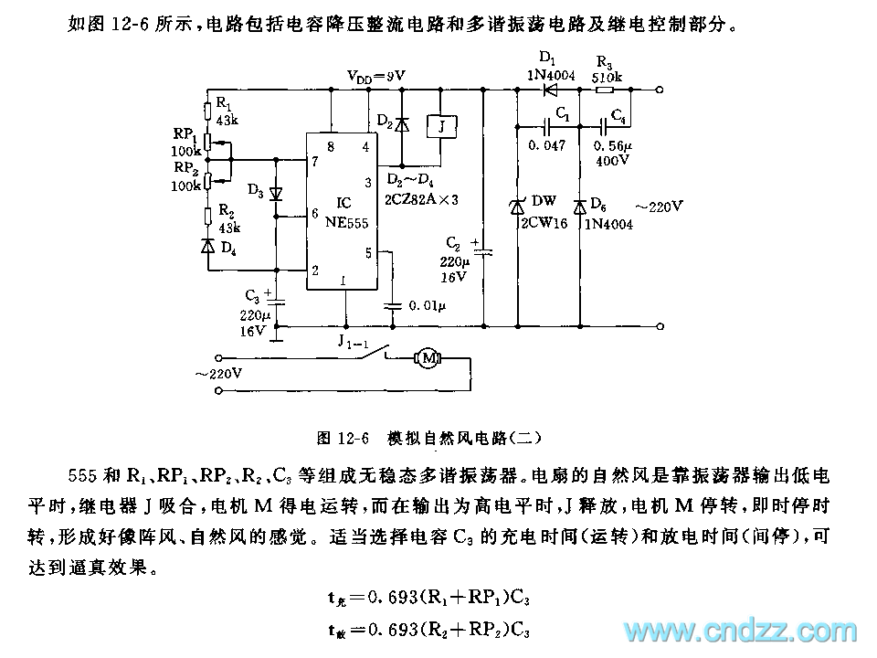 As shown in Figure 12-6, the circuit includes the capacitor step-down rectifier circuit and multivibrator circuit and relay control section. 555 and R1, RP1, RP2, R2, C3 and other components form an astable multivibrator. The natural wind of fan is based on the low oscillator output, the relay J pullling could make the motor M operate, while the output is high, J releases, the motor M stops. That is the motor turns on and off intermittent, and the feeling is like gust, natural wind. Proper selection of charging time and discharging time of capacitor C3 can achieve realistic results.
