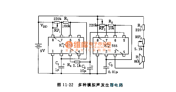 As shown in the figure 11-22, the circuit is composed of two 555 and some resistor capacitor components, the astable multivibrator connsists of IC1 and RP1, R1, C1, the oscillation frequency is about 5~10Hz, it can be changed by adjusting RP1. The frequency of oscillator which is made of IC2 and RP2, R2, C2 is between 1~10kHz, it can be changed by adjusting RP2, IC2 is a controlable voltage oscillator, its control terminal 5 foot is controlled by triangular wave voltage, this triangular wave is obtained from IC1 output and then integrated by R4, C3 integration circuit. IC2's oscillation frequency changes in relation to control voltage, it will send out all kinds of analogue sound, such as cricket noise and bird sound.