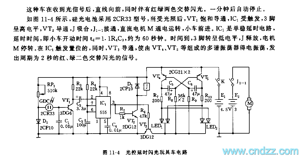 As shown in the figure 11-4, silicon photocell adopts 2CR33 type, after illuminated, VT1 is saturation conduction, IC1 is triggered, 3 foot is high level, VT2 turns on, J pulls in, J1-1 turns on, DC motor M operates, the car moves. IC1 is monostable delay circuit, the delay time also is the car's running time td=1.1R4C3, it is about 60s. When it is time out, 3 foot turns to low level, J releases, motor M stops running. IC1 triggers setting, simultaneously, VT3 turns on, the multivibrator which is composed of VT4, VT5 starts to vibrate, it sends out the signal of red and green alternately flashing, the period is 2s.