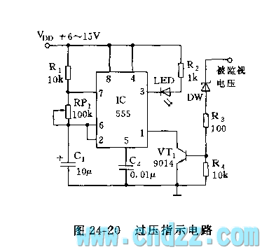 As shown in Figure 24-10, 555, R1, RP1 and C1 form astable multivibrator, but its ground pin is connected to c pole of detection transistor. When the monitored voltage exceeds set value, DW is breakdown, VT1 is saturated and turned, then 555 starts oscillation, LED light flashes. VT1 can also reduce the static power dissipation of 555. 555 oscillation frequency can be adjusted between 1 ~ 20Hz, and RP1 can be used to select the flashing number of LED.