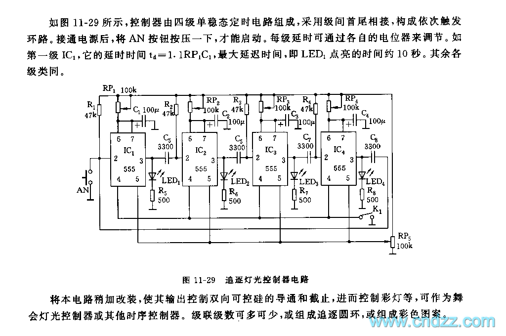 As shown in the figure 11-29, the controller is composed of 4-step monostable timing circuit, it adopts interstage head-tail connecting to form ordinal trigger loop. After connected the power supply, only AN button is pressed, it can run. Each step's delay can be adjusted by its potentiometer. Such as the first step, its delay time td=1.1RP1C1,the max delay time, namely, the time of LED1 lighting is about 10s. The other steps are the same.
