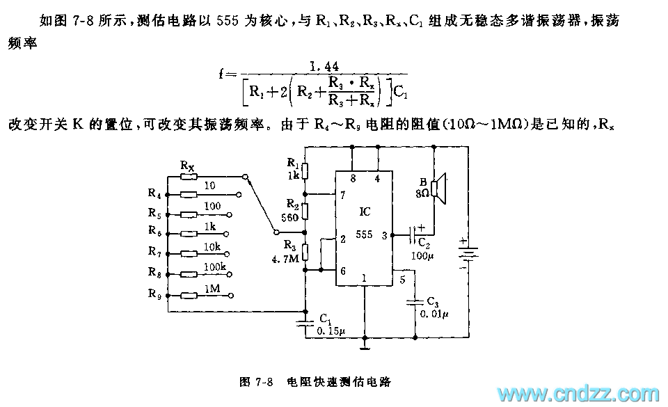 Changing the switch K can change the oscillation frequency. Since R4 ~ R9 resistor (10Ω ~ 1MΩ) is known, Rx is the resistance under test,it caneasily and quickly determine the resistance of Rx by the comparison of the sound with correspondingoscillation frequency of known resistors.