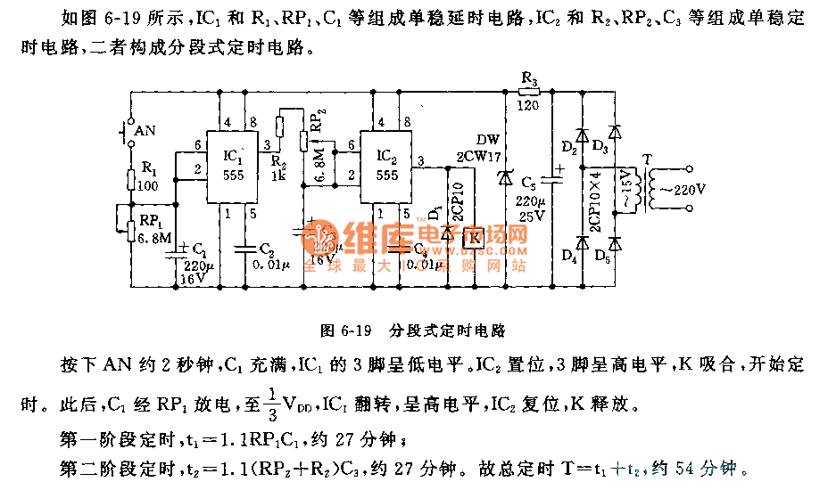 As shown on the figure 6-19, the mono-stable time delay circuit consits of the IC1 and R1,RP1,C1. The mono-stable timing circuit consists of the IC2 and R2,RP2,C3.They constract the sectional timing circuit. Pressing the AN about 2s, the IC1's 3 foot is low power level. The IC2 reset, the 3 foot is high power level and the K will be pull-in. Then the C2 will discharge by the RP1 to the 1/3VDD. The IC1 will flip and be the high power level. The IC2 will reset and K will release. The first timing, t1=1.1RP1C1, about 27 minutes. The second timing, t2=1.1(RP2+R2)C3, about 27 minutes. The total timing, T=t1+t2, about 54 minutes.
