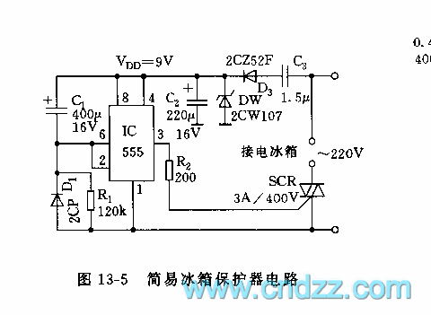 The circuit is shown in Figure 13-5, the protection is mainly used for power delay protection to avoid the compressor from frequent start, and mechanical damage from the non-equilibrium state. When it stops, the voltage on C1 discharges through D1 immediately. When it gets power again, because the voltage on C1 is not mutation, 555 is in the reseting state; until C1 is charged to td = 1.1R1C1, which is about 6 minutes, 2 foot level is below the 1/3 VDD, 555 is set, the SCR then is connected, refrigerator is running.