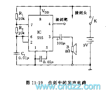 The circuit is shown as figure 11-19, 555 is the core of the circuit. The pin 4 of 555 is the reset terminal, when the voltage is below 0.7V, then the shock ends. The leading wire of pin 4 is connected to metal arrow, if hitting the target is connected to the power (higher than 1.4V) in the game, the 555 circuit will shock, vibration frequency depends on R1, R2, C1's value, that is, f = 1.44 (R1 +2 R2) C1. icon parameter frequency is about 800Hz, if hitting, it will emit sound. If tipis away from the target, the circuit is forced to be in reset state.