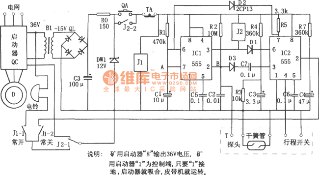 Start upcircuit is composed of the start button QA, IC1 (555), IC2 (555), J1 and so on. When you press the QA, the +12 V voltage output by the buck rectifier circuit will be added to IC1, IC2, then relay J1 will be pulled. It also starts the bell ring. When it adds a +12 V voltage, the IC1 is set aspin potential of pin ② is low (the voltage on C1can not mutate), and C1 charges for R1, when the C1 charges to make IC1 ⑥ potential higher than 2 feet / 3VDD, IC1 will be reset.
