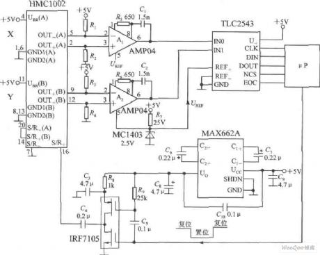 Dual-axis magnetic field sensor application circuit is shown. A two-axis magnetic sensor HMC1002 and two pieces of AMP04 (A1, A2) are used to simultaneously measure the magnetic field of X-axis direction and Y-axis direction. Dual-direction voltage signal output by HMC1002 can be respectively amplified by A1 and A2. And they are connected to the 12 bit A / D converter TLC2543 analog input and reference terminal. Then it is connected to μP through the interface circuit. MAX662A is the efficient DC / DC converter, which raises + 5 V power supply to 10 V power supply. The 10 V power supply can power the drive IRF7105. The input signal of the drive is from the μP.