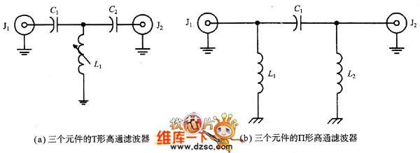Figure (a) and Figure (b) show single high-pass filters. These are inversions of LPF single low-pass filters. Capacitance is placed in series in the signal path but the inductance is placed in parallel in the signal channel. The model shown in the figure (a) is T-shaped structure that shown in the figure (b) is Ⅱtype filter.