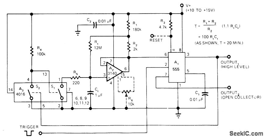 FET-input 3140 opamp is used to multiply effective values of timing components Rt and Ct, eliminating need for high-value precision resistor and large low-leakage capadtor. Combination performs as standard 555 mono except that timing equation is T = 100RtCt (for condition wherein division resistors R1 and R2 are chosen for 91-to-1 operation). Circuit has uncommitted open-collector output from pin 7 of 555, which can be referred to any voltage from 0 to + 15 V. Pin 4 is between pins 6 and 8 on 555.-W. G. Jung, Take a Fresh Look at New IC Timer Applications, EDN Magazine, March 20 1977, p 127-135.